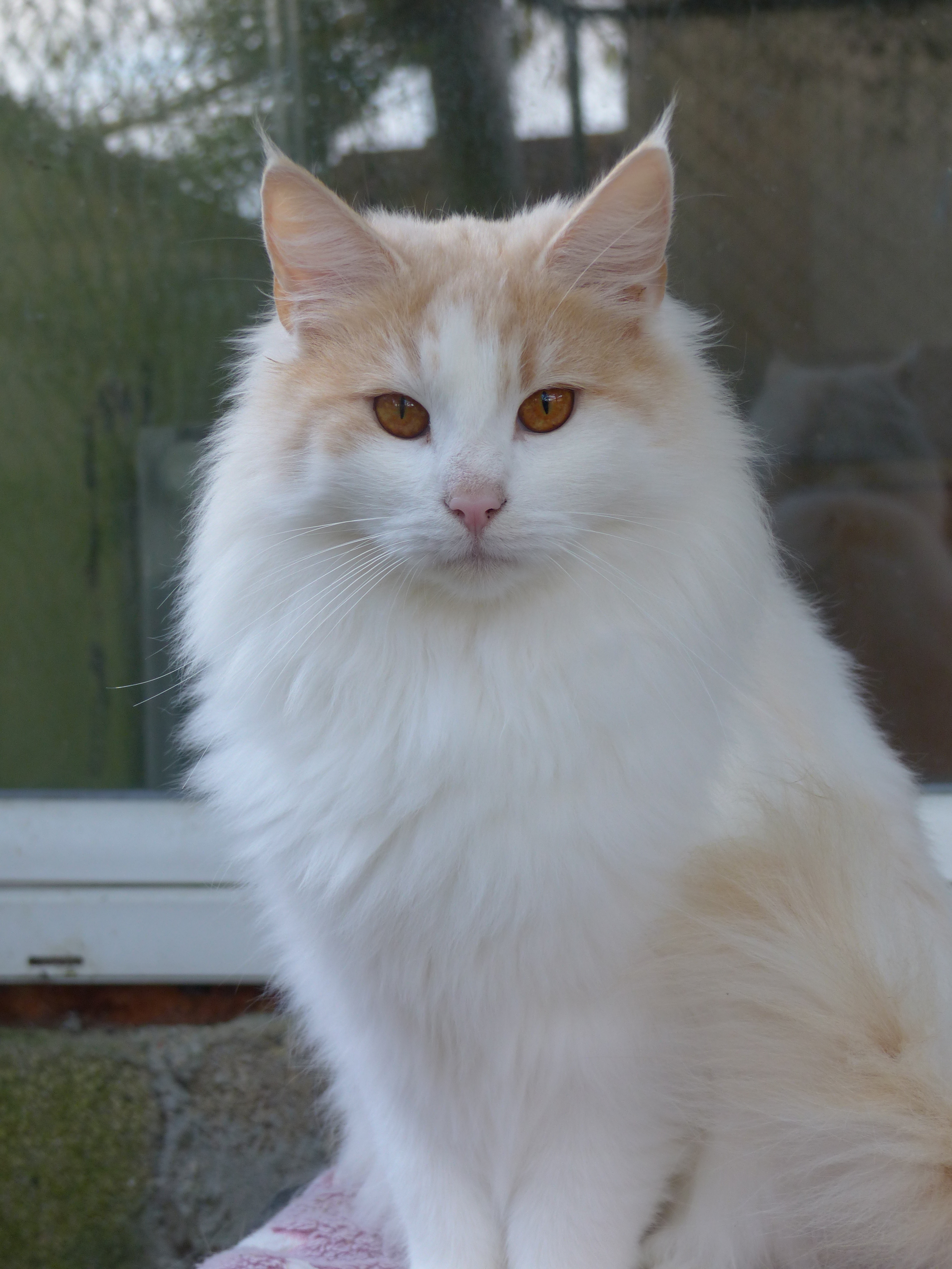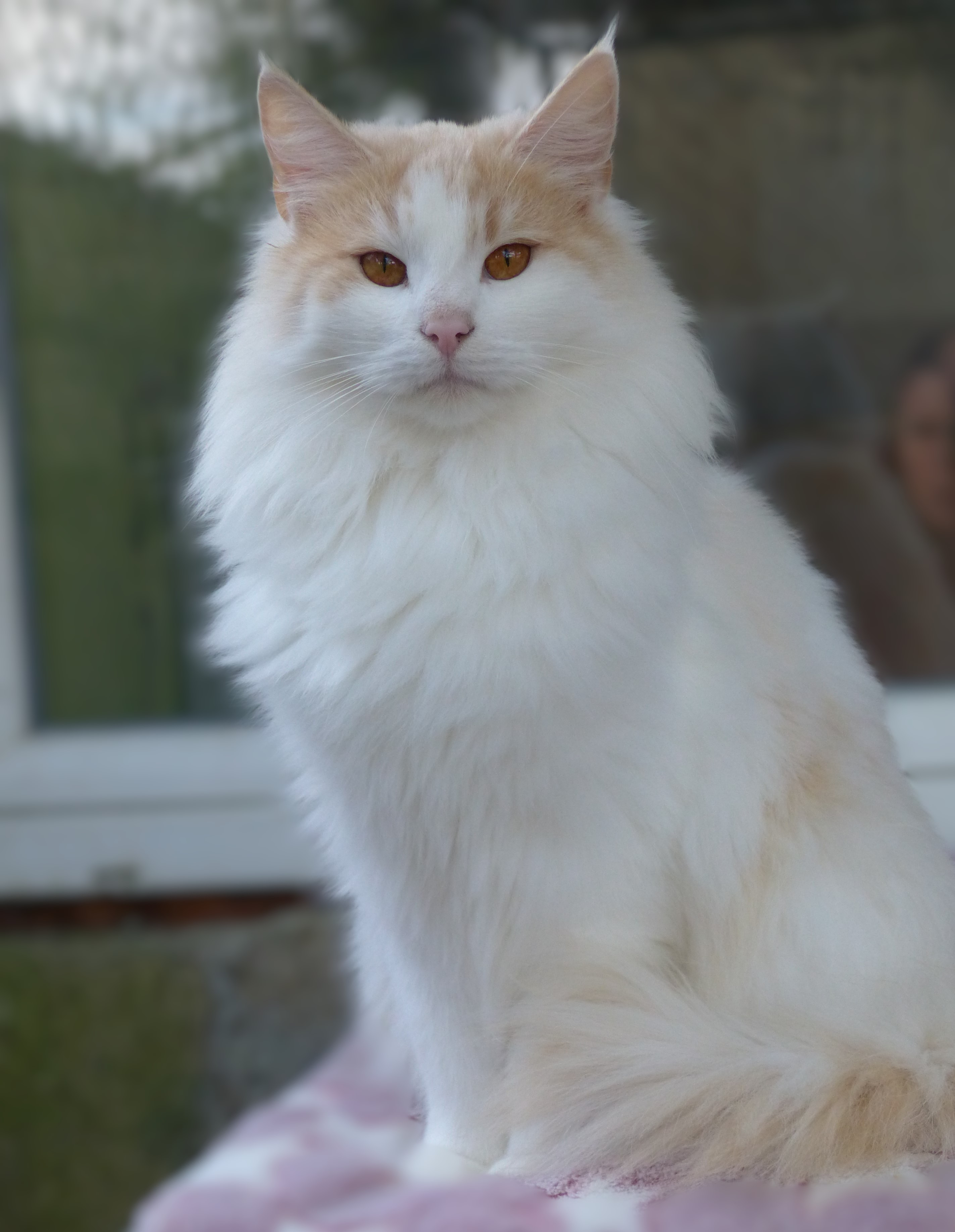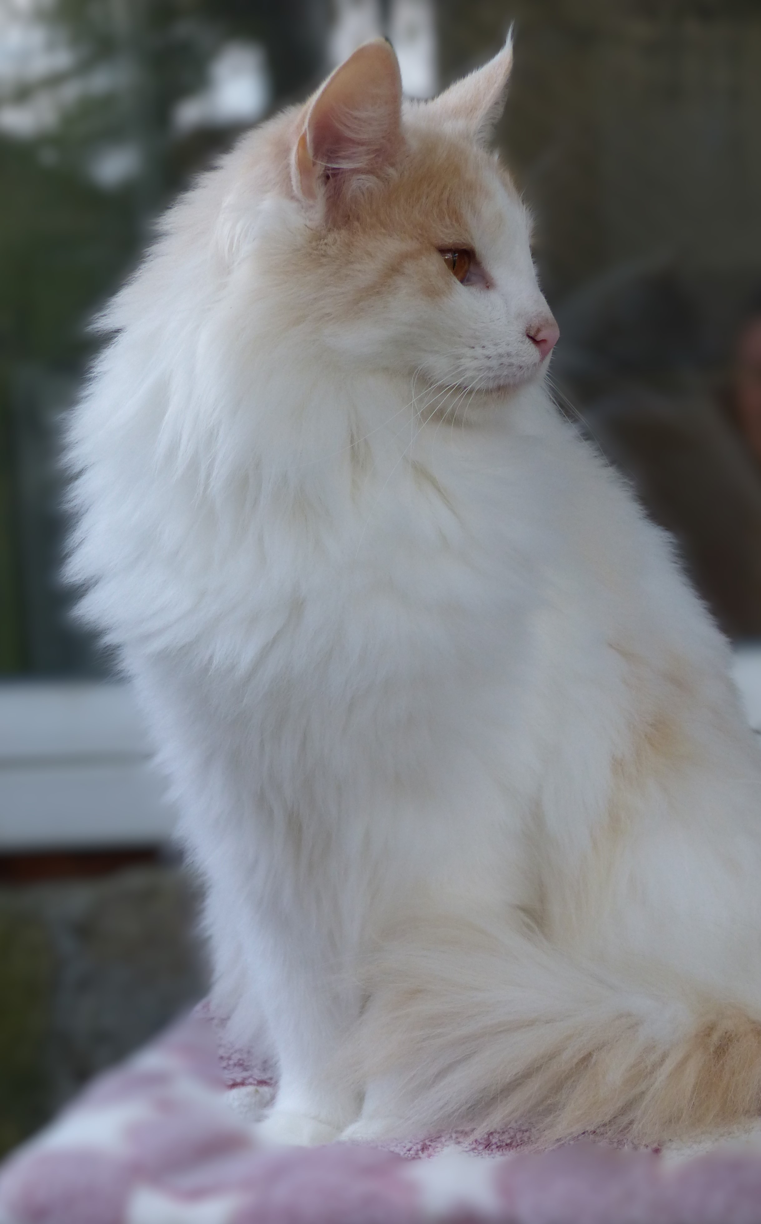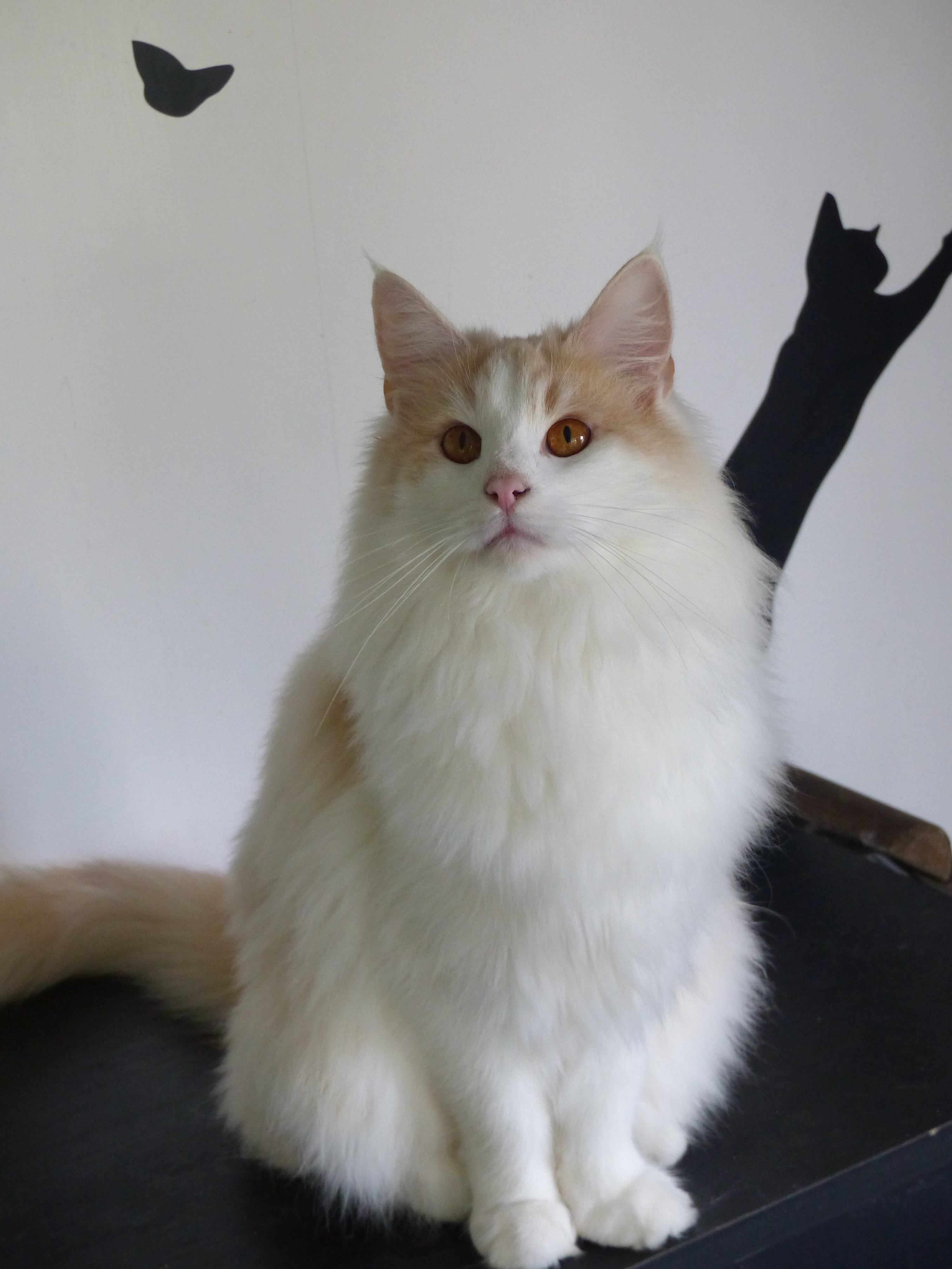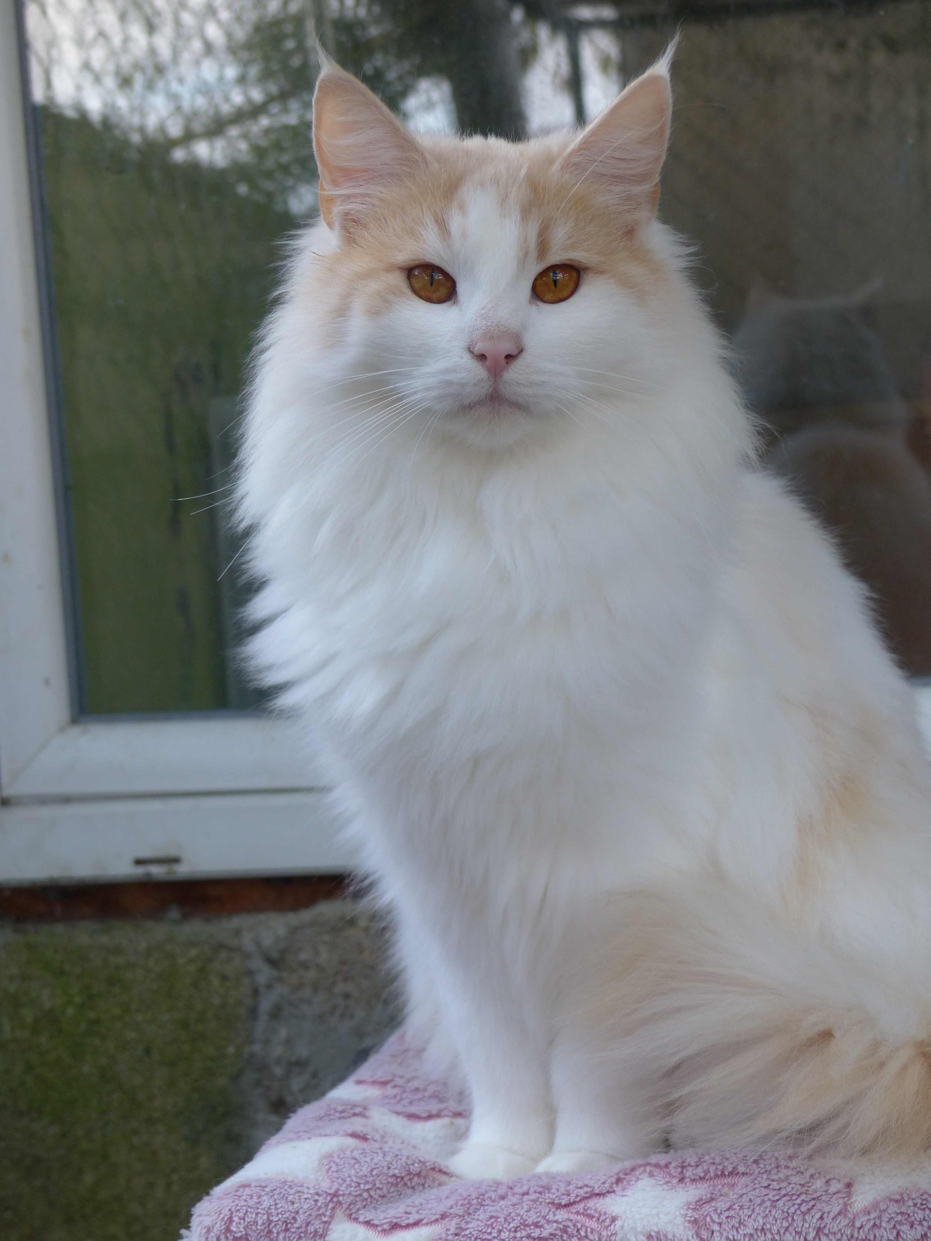 Topaze est une gentille chatte plutôt timide et assez peureuse. Elle est de petit gabarit mais avec un jolie placement d’oreilles, de beaux yeux en amandes et un corps long et musclés. Elle a une belle fourrure soyeuse qui ne fait pas de noeuds et donc qui nécessite moins d’entretien que son père. J’aime beaucoup son ensemble harmonieux et ce qu’elle dégage.
