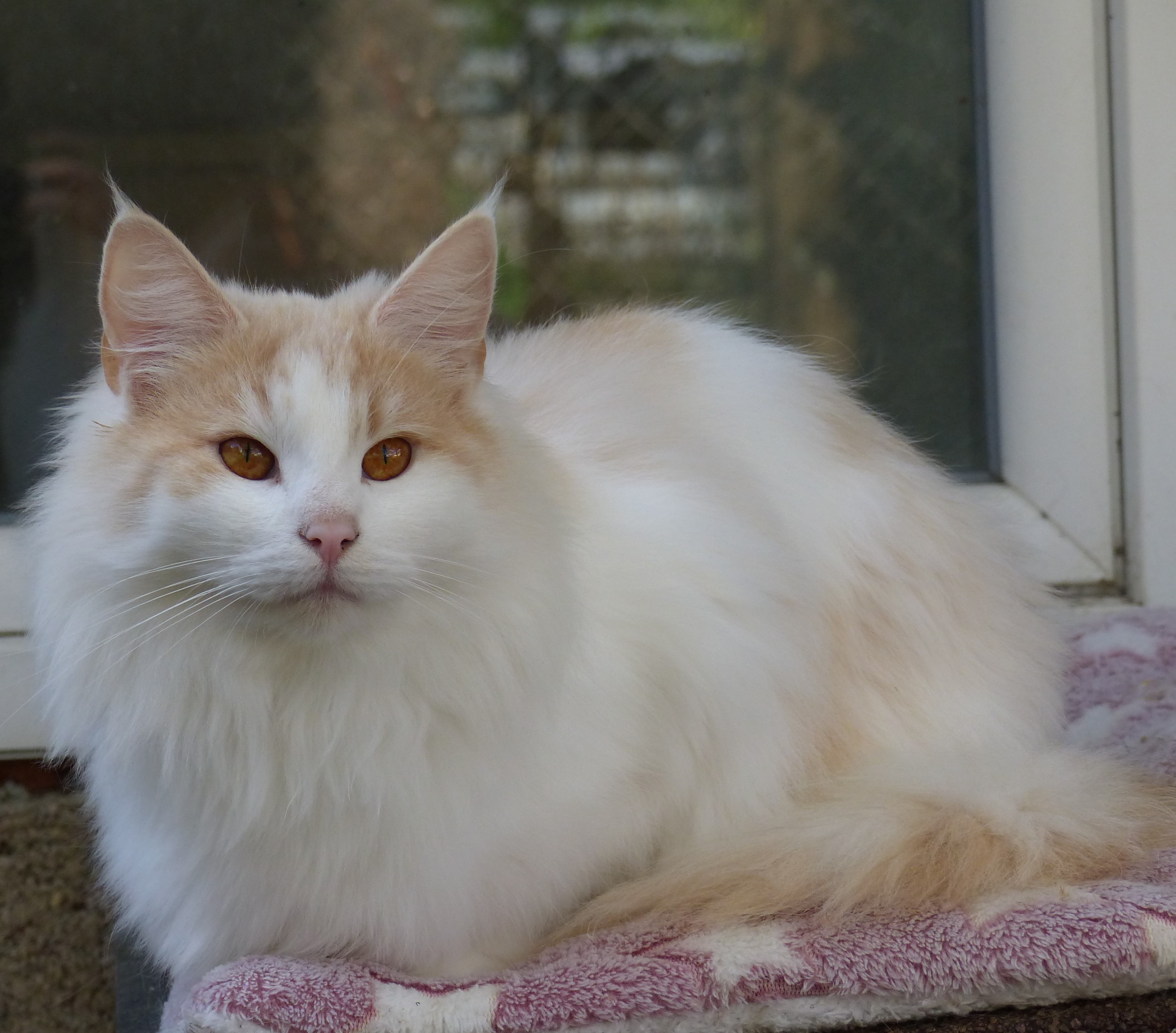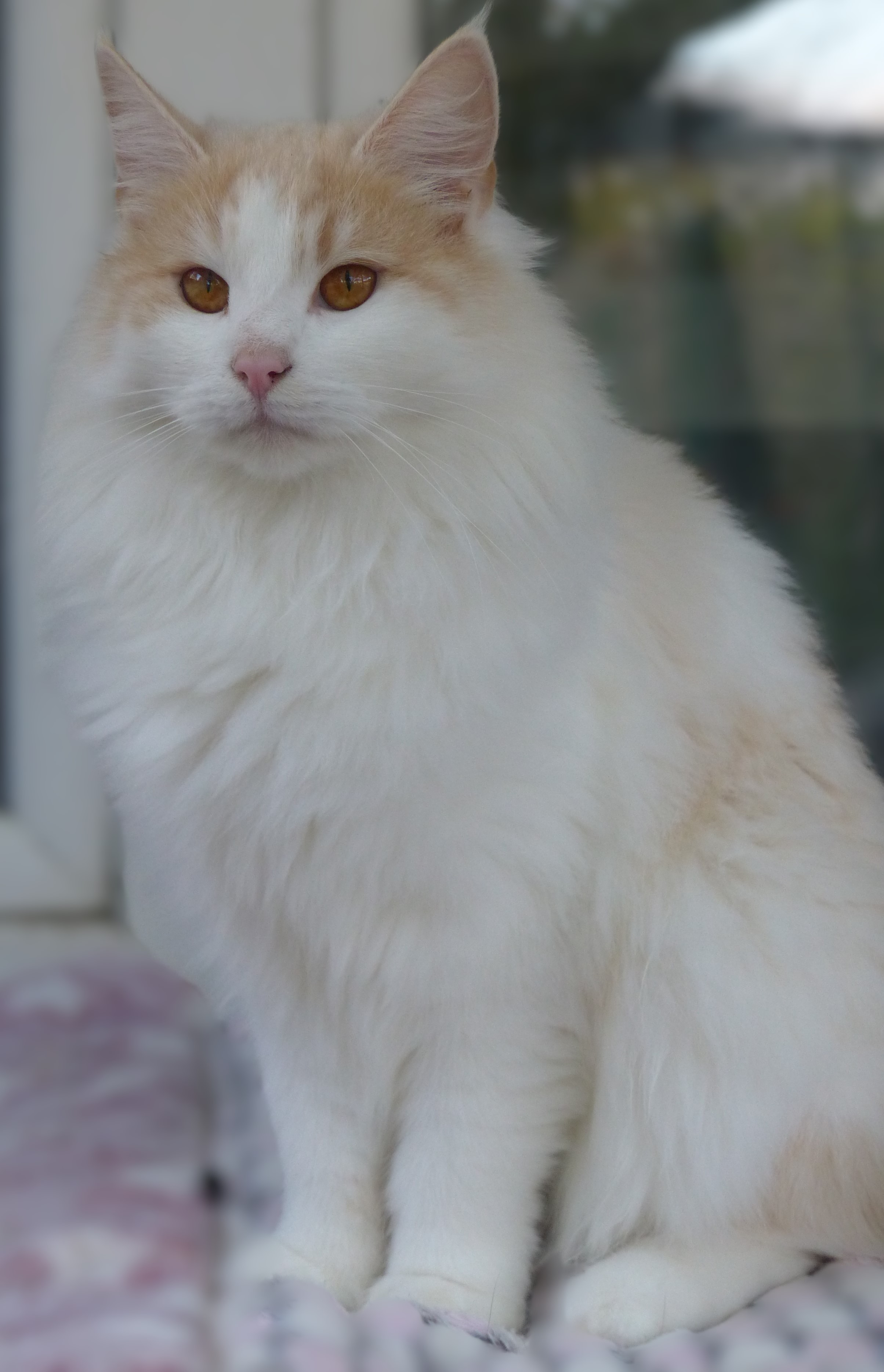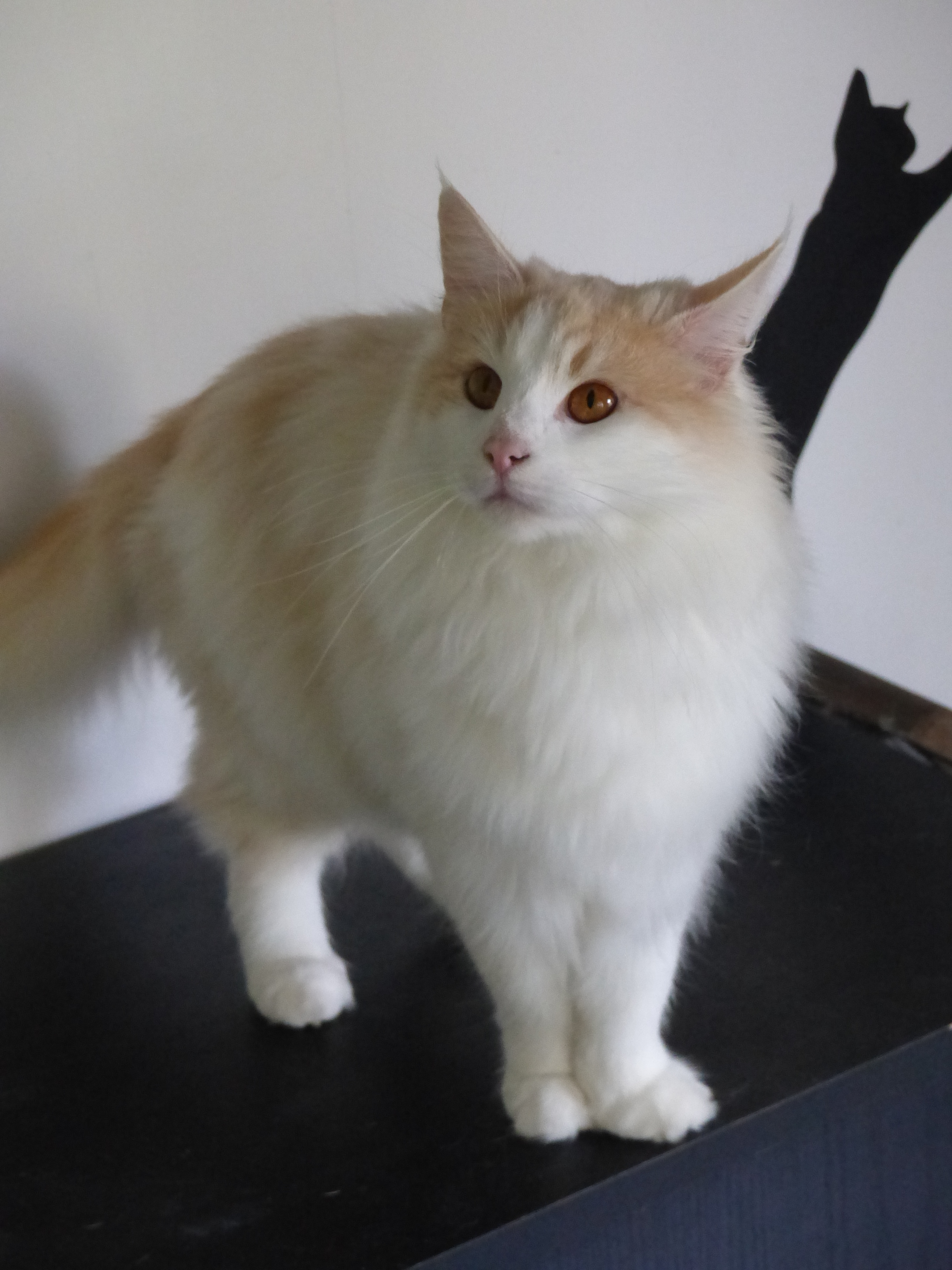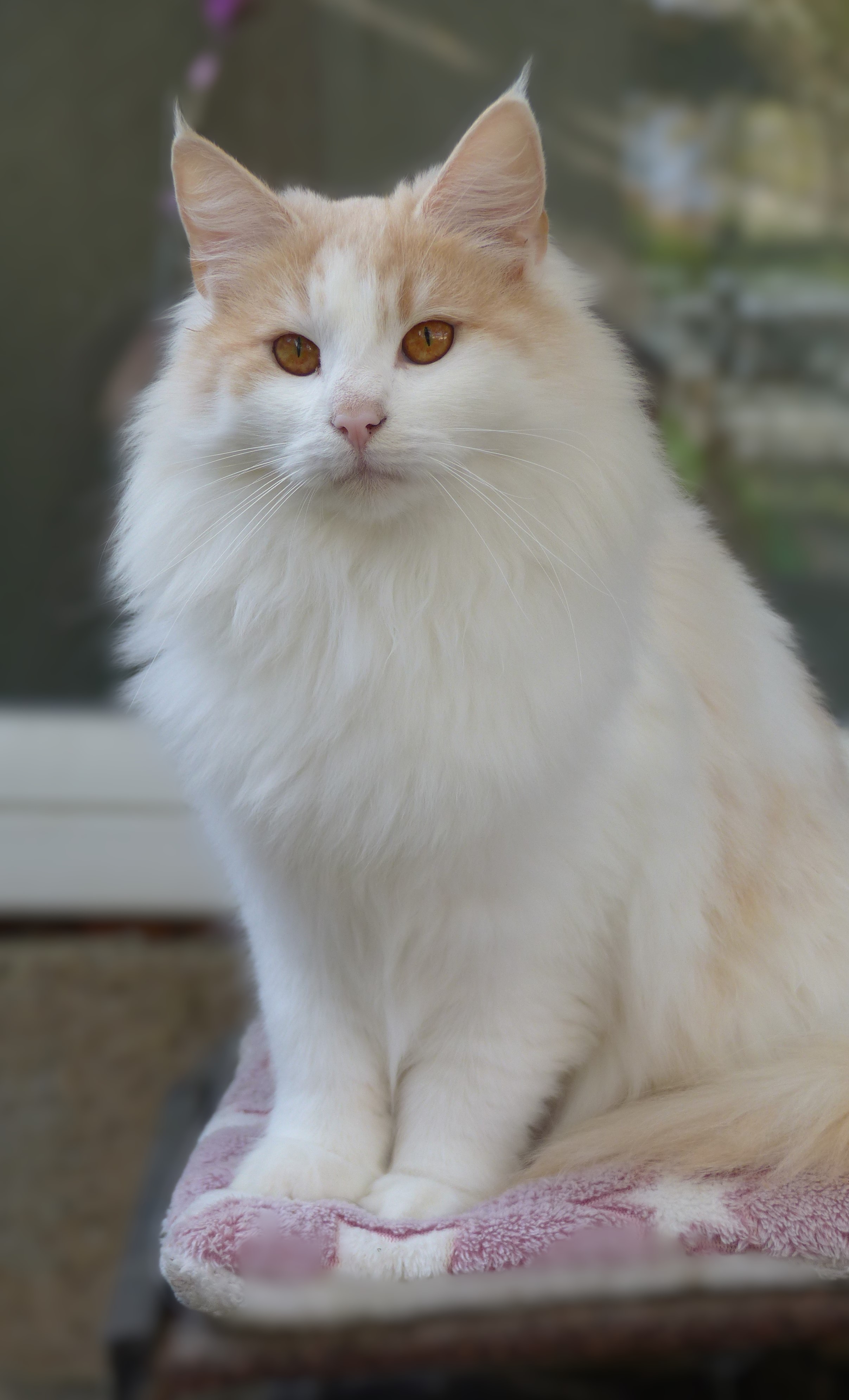Topaze est une gentille chatte plutôt timide et assez peureuse. Elle est de petit gabarit mais avec un jolie placement d’oreilles, de beaux yeux en amandes et un corps long et musclés. Elle a une belle fourrure soyeuse qui ne fait pas de noeuds et donc qui nécessite moins d’entretien que son père. J’aime beaucoup son ensemble harmonieux et ce qu’elle dégage.