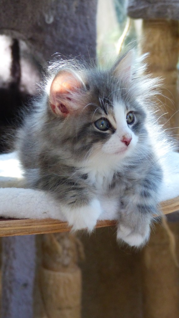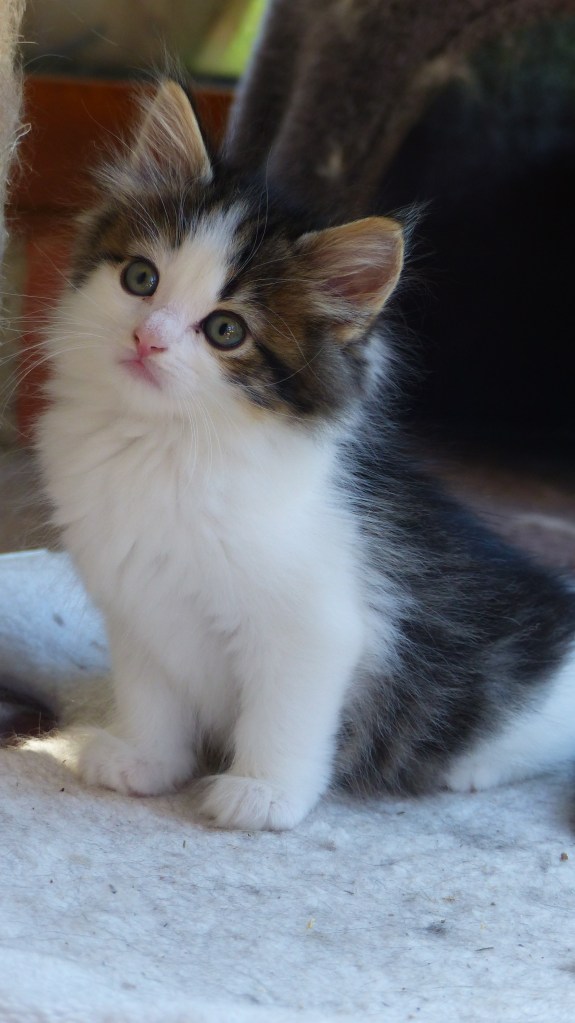 - Divina Stella Ruby’ s Snow (Rime): Femelle blue tortie blotched tabby et blanc